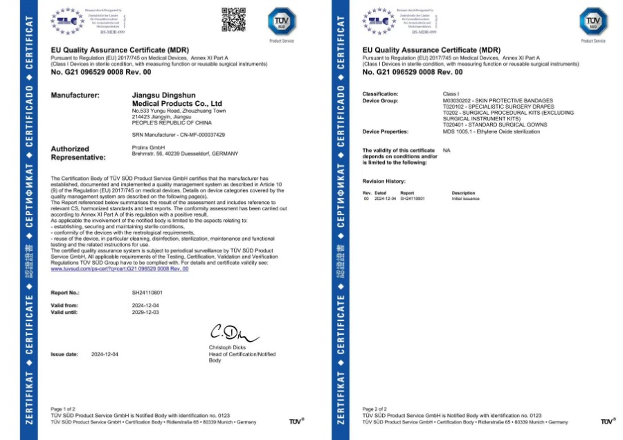 Dingshun Medical har nå bestått mange internasjonale sertifiseringer, inkludert CE, MDR, FDA, ISO13485 og ISO9001.